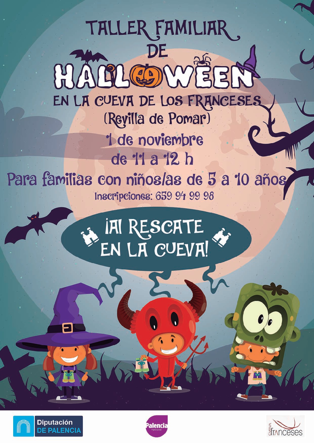 La Diputación de Palencia propone un plan familiar para el próximo 1 de noviembre, festividad de Todos los Santos; un taller de temática Halloween, ¡Al rescate en la cueva!, para familias con niños/as de edades comprendidas entre los 5 y los 10 años que se desarrollará de 11 a 12 horas. Los interesados pueden inscribirse en el teléfono: 659 94 99 98.