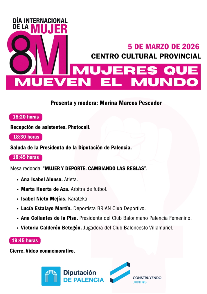 La institución provincial adelantará la celebración al jueves 5 de marzo, a partir de las 18:20 horas, en el Centro Cultural Provincial, con la mesa redonda titulada “Mujer y Deporte. Cambiando las reglas”, un espacio de encuentro y reflexión que reunirá a destacadas mujeres palentinas cuya trayectoria es ejemplo de esfuerzo, liderazgo y superación.