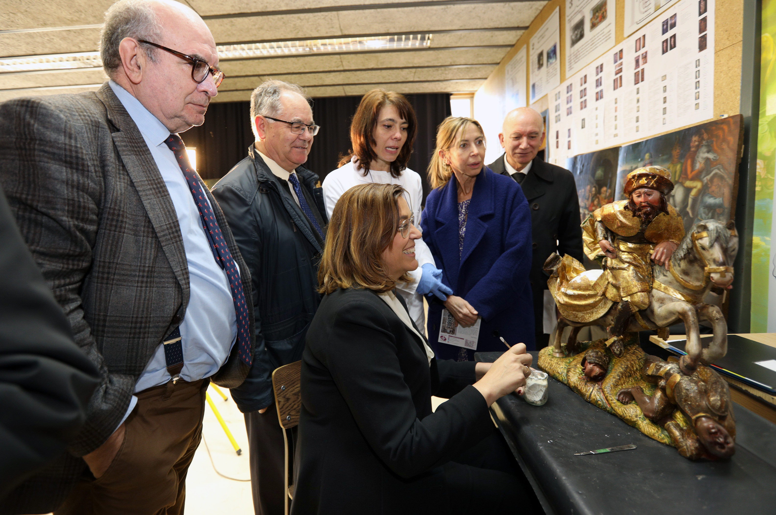 La presidenta de la Diputación, Ángeles Armisén y el vicario general de la Diócesis palentina, Anastasio González, acompañados por la diputada de Cultura, Carmen Fernández, el diputado de Museos, Javier Villafruela y el delegado diocesano de Patrimonio, José Luis Calvo, se desplazaban esta mañana hasta las instalaciones donde se están desarrollando los trabajos del Taller de Restauración de Obras de Arte, a través del cual, de nuevo 10 restauradores trabajan en la recuperación de piezas procedentes de 23 localidades palentinas, de las que 9 son pinturas, 18 esculturas, 3 sagrarios, 4 mazonerías de retablo y 6 textiles. En total está prevista la intervención en 39 piezas este año, cantidad similar a la de pasadas anualidades, y cuya selección responde a criterios de calidad y urgencia en el arreglo de las mismas, ubicación, etc.