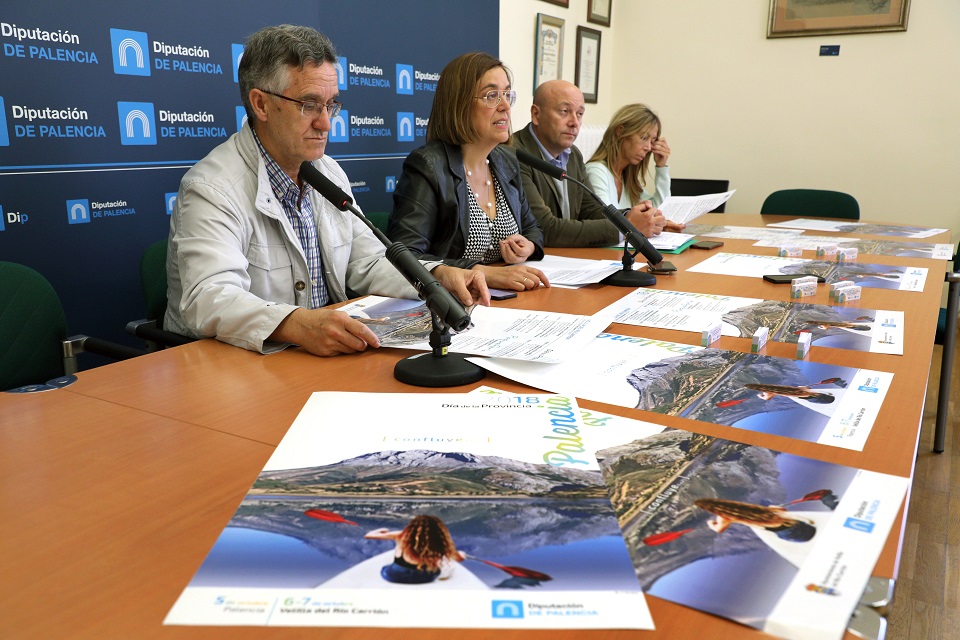 La presidenta de la Diputación, Ángeles Armisén, acompañada por el vicepresidente y diputado de Turismo, Luis Calderón,  la diputada de Cultura, Carmen Fernández y el alcalde de Velilla del Río Carrión, Gonzalo Pérez; ha presentado esta mañana el programa del XXXIV Día de la Provincia, que seguirá con el modelo abierto a la doble celebración institucional y popular, iniciado hace ya dos años, y que en esta ocasión se desarrollará en la capital palentina el día 5 de octubre y en Velilla del Río Carrión durante los días 6 y 7 de octubre.