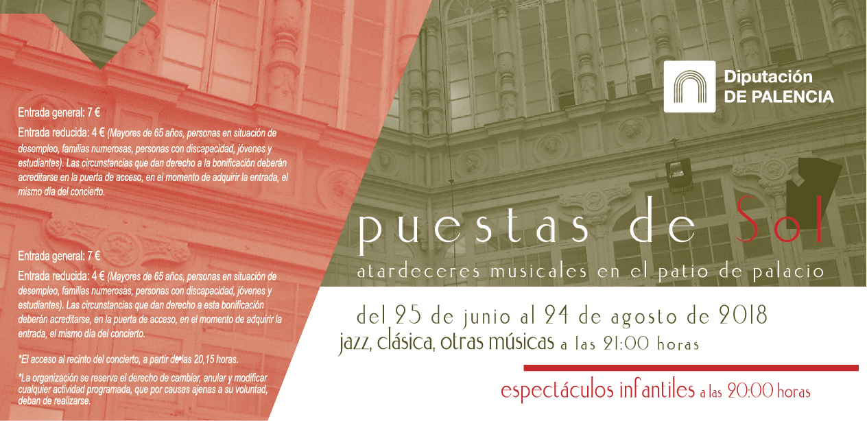 ENTRADAS. Las entradas a los espectáculos organizados serán gratuitas, salvo en las Puestas de Sol en el Palacio Provincial, cuyo coste será de 7 euros, y de 4 € para las entradas bonificadas a personas mayores de 65 años, familias numerosas, jóvenes y estudiantes, personas con discapacidad y personas en situación de desempleo. Las entradas para “Castillo Mágico. Magia en Fuentes de Valdepero” tendrán un precio único de 1 euro y los fondos recaudados durante el ciclo se destinarán, un año más, a las entidades sin ánimo de lucro que trabajan con los grupos más desfavorecidos de la capital.