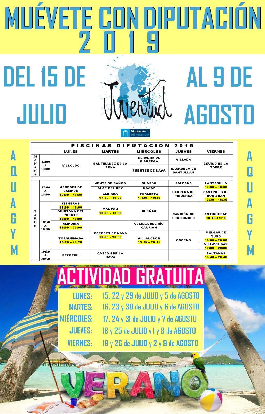 Este año 2019 el Aquagym se ofertará como actividad gratuita a través de la cual disfrutar de un baño que refresque el calor y dinamice el uso de las piscinas de verano a través de un deporte liviano y entretenido apto para todas las edades.