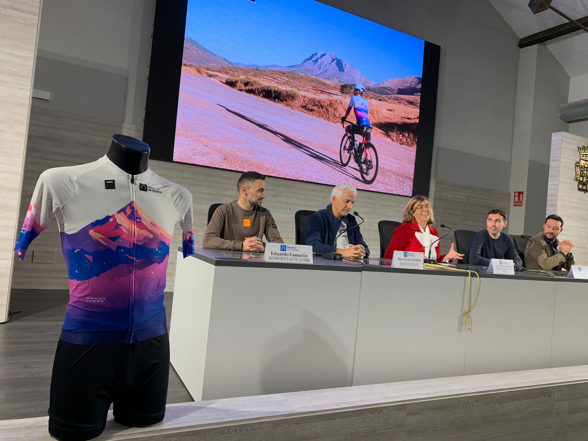 La presidenta de la Diputación de Palencia, Ángeles Armisén, acompañada por el diputado de Deportes, Eduardo Tejido, y los representantes de MAHLE y GOBIK, Marco Antonio de la Serna y Eduardo Camarón, respectivamente, así como por el autor del diseño, Miguel Berzosa, ha presentado el nuevo maillot ciclista con el que la Diputación de Palencia pretende dar avanzar en el impulso al fomento de la Montaña Palentina como destino turístico vinculado a la práctica del deporte.