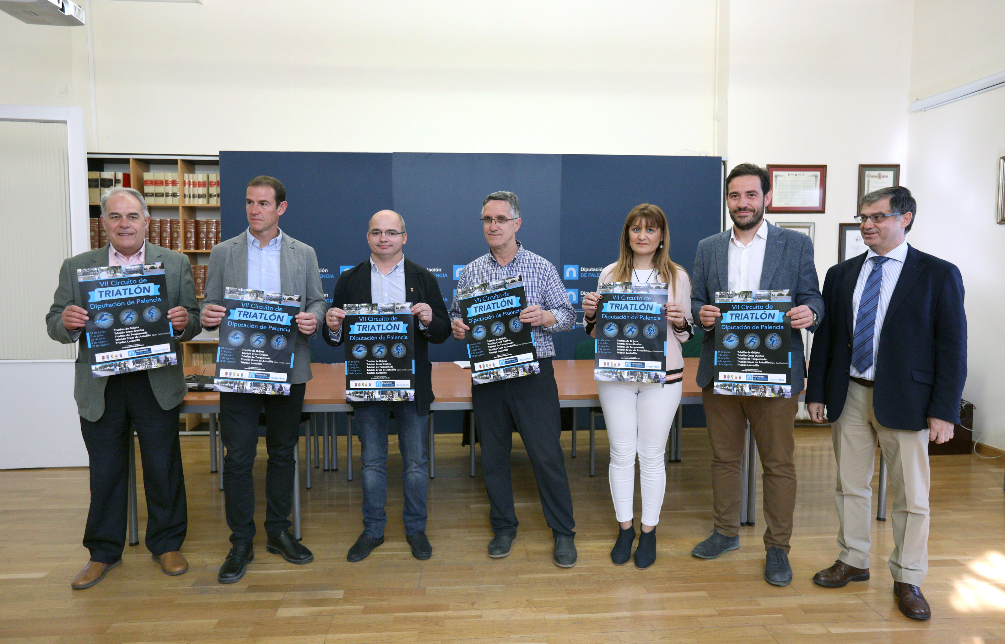 El Diputado de Deportes, Gonzalo Pérez, acompañado por el Coordinador de Deportes de la Diputación, Enrique Hermoso, por el presidente de la Federación de Castilla y León de Triatlón, Amancio del Castillos, y por los representantes de los ayuntamientos de Grijota, Dueñas, Astudillo y Lantadilla, ha presentado la séptima edición del Circuito de Triatlón “Diputación de Palencia”.