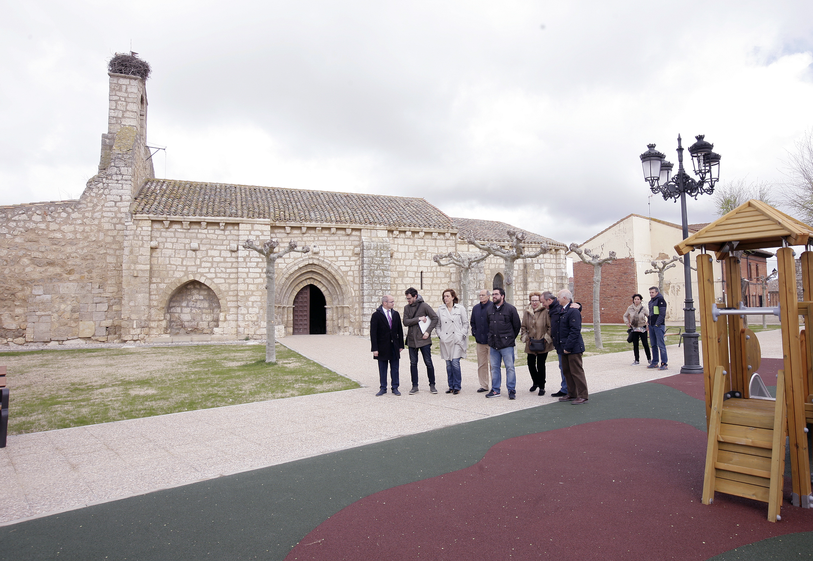 En la primera parte de la visita han podido comprobar de primera mano este parque cuyas obras han tenido un doble objetivo; En primer lugar el saneamiento de le los entornos de la Ermita románica del S.XIII, eliminando así las humedades al edificio, el cual necesita realizar obras de consolidación que también serán atendidas por la Diputación y la Diócesis de Palencia. El segundo objetivo ha sido la mejora de las condiciones generales del parque al encontrarse en mal estado. Para ello, se ha ejecutado un pavimento de caucho, se ha sembrado césped en las zonas ajardinadas y se ha instalado riego automático.