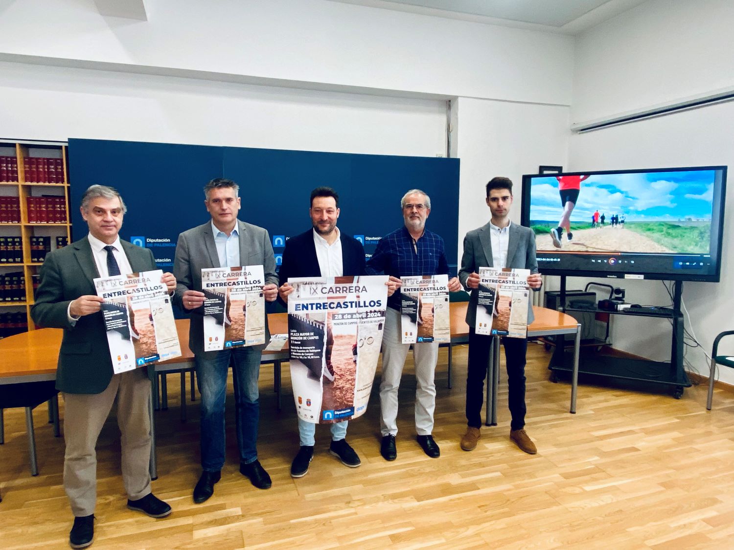 El diputado de Deportes, Eduardo Tejido, junto con el coordinador de Deportes, Enrique Hermoso, y los alcaldes de Fuentes de Valdepero, Gonzalo de Celis, y de Monzón de Campos, Mariano Martínez, han presentado esta mañana la Carrera “Entre Castillos”, que se celebrará el próximo 28 de abril entre las fortalezas de Monzón de Campos y Fuentes de Valdepero.