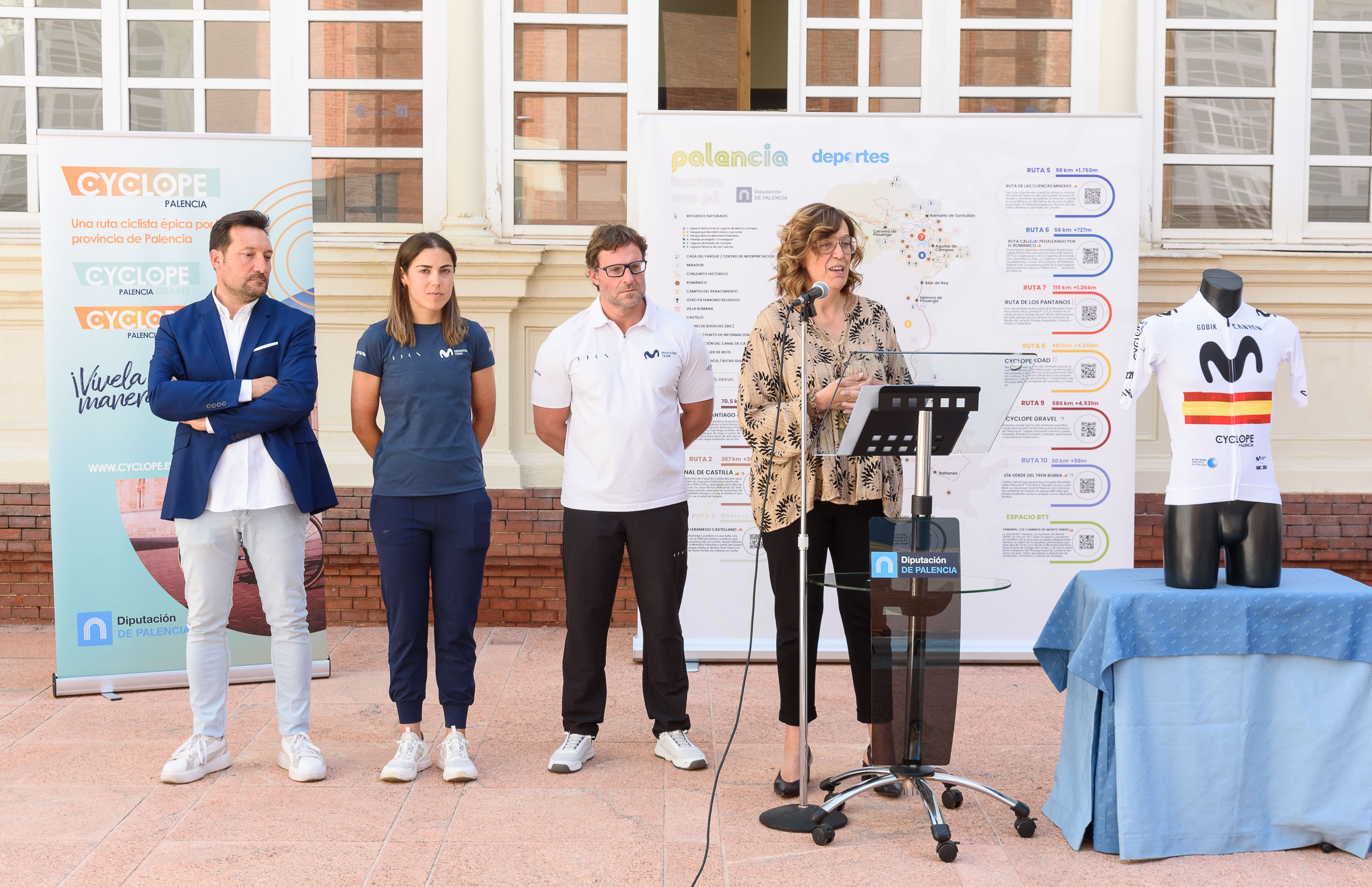 El Palacio Provincial de Palencia ha acogido esta mañana la presentación oficial de la estancia del Movistar Gravel Squad en la provincia, el equipo profesional de ciclismo especializado en la modalidad de gravel —la disciplina en auge que combina caminos, pistas y asfalto en recorridos de aventura—, patrocinado este año por la Diputación de Palencia a través de su marca cicloturista Cyclope Palencia.
