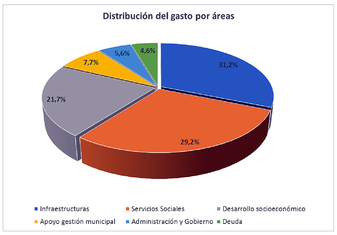 Una primera aproximación a las áreas de gasto revela que la Diputación empleará algo más del 31% del presupuesto a infraestructuras, cerca del 30% a servicios sociales, el 22% en fomento del empleo y el desarrollo socioeconómico de la provincia y casi el 8% al apoyo a la gestión municipal, cuatro áreas que representan aproximadamente nueve de cada diez euros del gasto. El resto se destina al propio funcionamiento general y gobierno de la administración (5,6%) y al pago de deuda, que apenas supone uno de cada veintidós euros que gestiona la Diputación (4,5%). Sobre este último aspecto —el endeudamiento—, cabe destacar que la deuda viva de la Diputación, a fecha 1 de enero de 2020 y tras liquidarse el presupuesto de 2019, asciende a poco más de 14,9 millones de euros y no llega al 25% de los ingresos corrientes consolidados (es decir, los ingresos regulares sin recurrir a préstamos, que el año anterior rondaron los sesenta millones de euros, incluso descontado unos 375.000 euros de ingresos por contribuciones especiales. Ese nivel de endeudamiento del 24,87% se sitúa lejos del límite del 110%, umbral a partir del cual existe la prohibición de concertar nuevas operaciones de crédito.