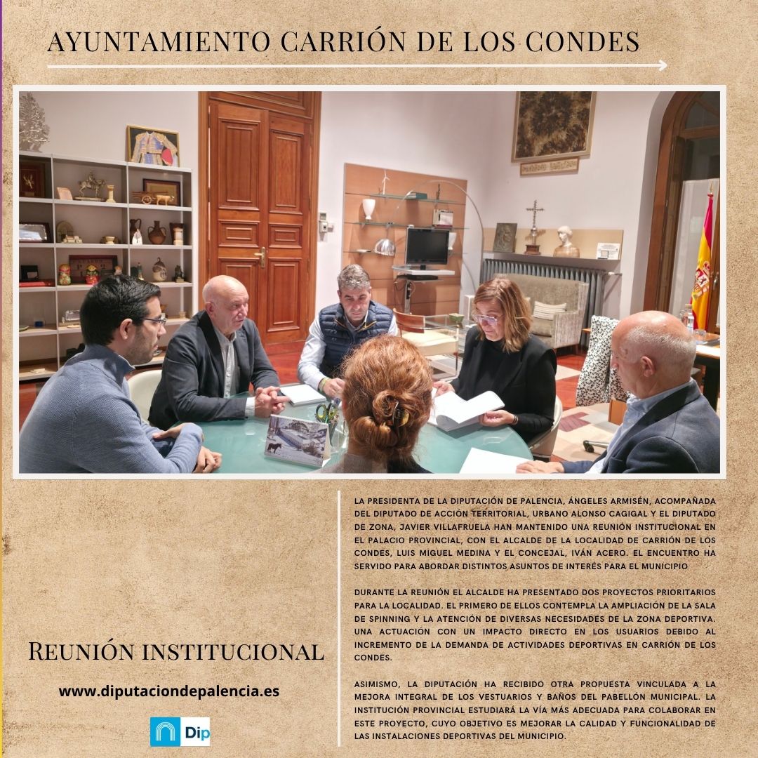 La presidenta de la Diputación de Palencia, Ángeles Armisén, acompañada del diputado de Acción Territorial, Urbano Alonso Cagigal y el diputado de zona, Javier Villafruela han mantenido una reunión institucional en el Palacio Provincial, con el alcalde de la localidad de Carrión de los Condes, Luis Miguel Medina y el concejal, Iván Acero. El encuentro ha servido para abordar distintos asuntos de interés para el municipio