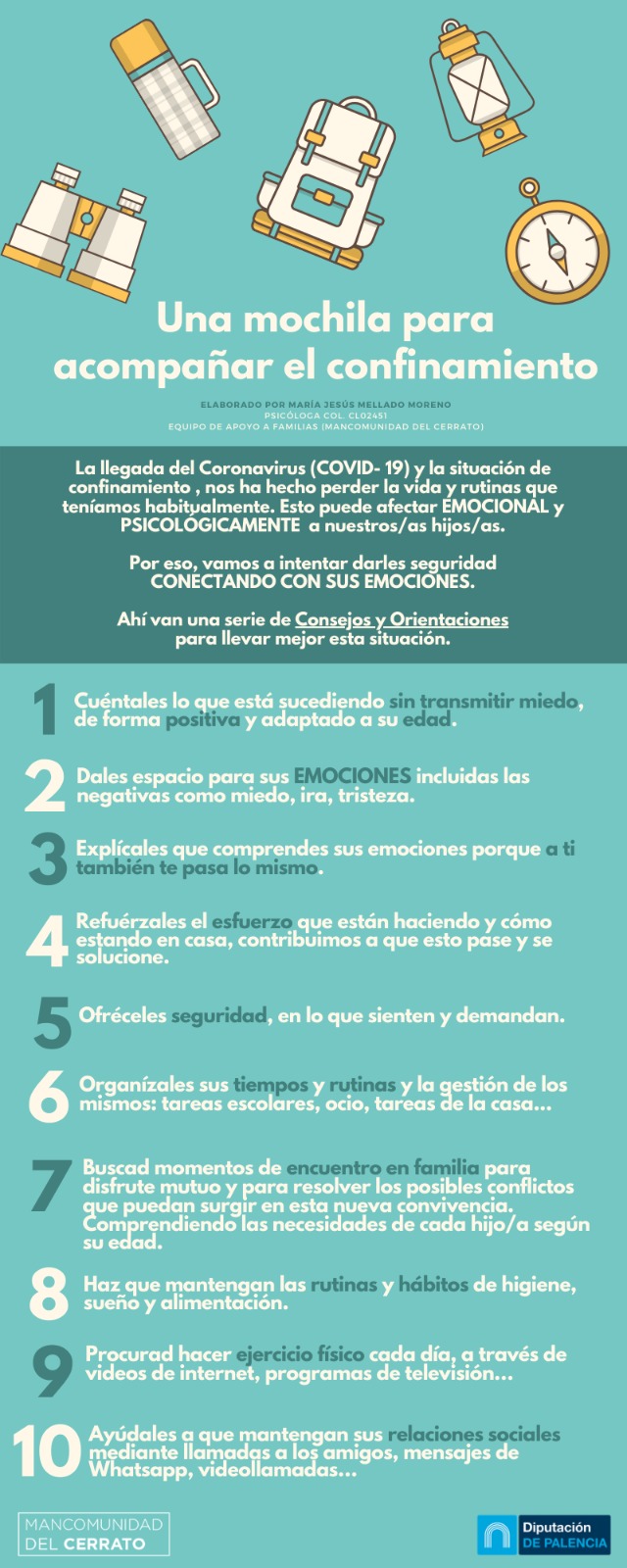 El resultado es: "Una mochila para pasar el confinamiento", un PDF con 13 diapositivas que recogen las orientaciones de una en una y una infografía que recoge el decálogo de recomendaciones.