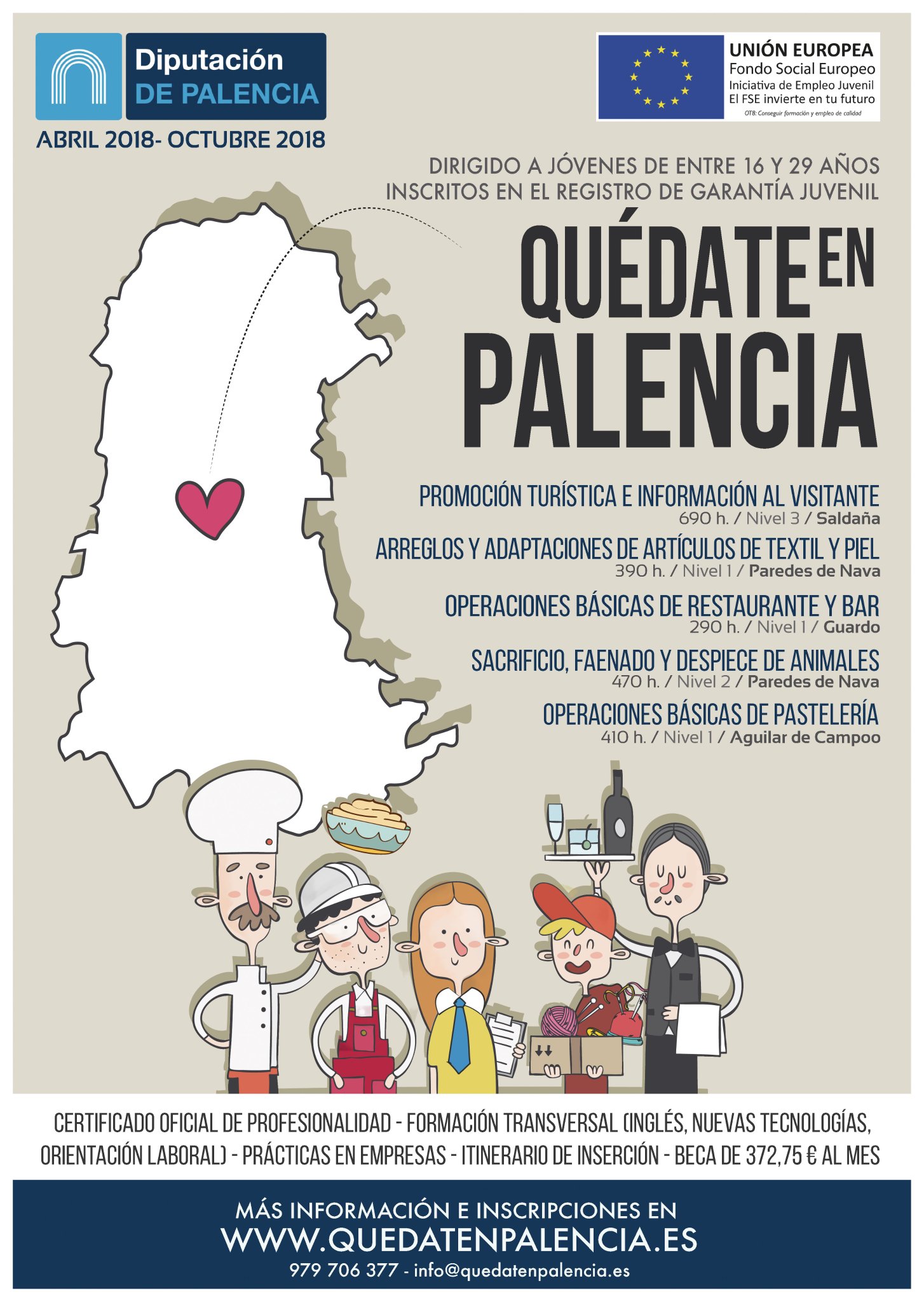 El Proyecto ‘Quédate en Palencia’ abre el plazo para inscribirse en las cinco acciones formativas que se van a desarrollar entre los meses de abril y octubre de 2018. El programa, puesto en marcha por la Diputación de Palencia a través de su área de Promoción Económica, está destinado a jóvenes de entre 16 y 29 años inscritos en el Sistema de Garantía Juvenil.