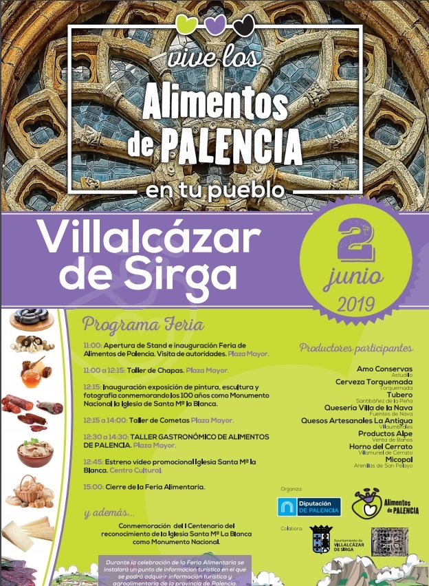 • La localidad de Villalcázar de Sirga acogerá este domingo, 2 de junio la segunda muestra Alimentaria organizada por la Diputación Provincial, para apoyar ese mismo día la conmemoración del I Centenario del reconocimiento de la iglesia Santa María La Blanca como Monumento Nacional.